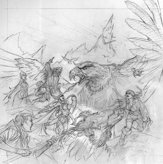 I have had great fun working on a succession of covers for Talisman, the board game. They are uniquely challenging in that I am working to create a unified image that involves very different existing characters. This time around they are battling a giant eagle as they approach the aerie lair of the Eagle King - at least the vampire won't feel the cold!